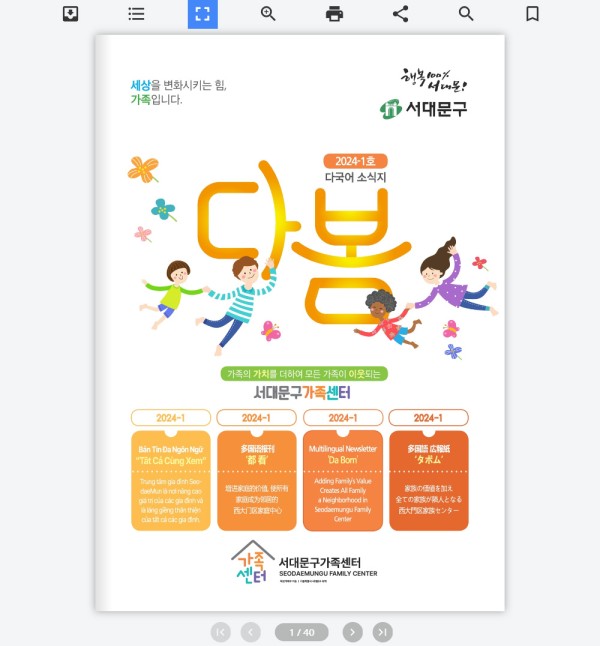 스마트eBook 서대문구가족센터 다국어소식지 ‘다봄 2024-1호’ 이북 제작 및 납품 페이지 정보 작성자 네오딕 댓글 댓글 0건 조회Hit 4,601회 작성일Date 24-11-08 16:24 본문 다봄 2024-1호 서대문구가족센터 스마트eBook 변환 24년 7월 작업 서대문구가족센터에서 의뢰한 ‘다봄 2024-1호’ 스마트eBook을 제작 및 납품하였습니다. 매 분기별로 꾸준히 제작 중인 다봄 소식지는 총 4가지 언어가 사용된 점이 특징입니다. 다양한 언어가 사용되어도 이북의 검색 기능을 통해 쉽게 정보를 찾을 수 있습니다. 목록 답변 게시판 리스트 옵션 검색 닫기 이전글소상공인시장진흥공단 사례집 ‘희망이 열린다 기회가 열린다’ 이북 제작 및 납품 24.11.21 다음글공평도시유적전시관 전시도록 ‘보신각, 시간의 울림’ 이북 제작 및 납품 24.11.07 댓글 0 댓글목록 등록된 댓글이 없습니다.